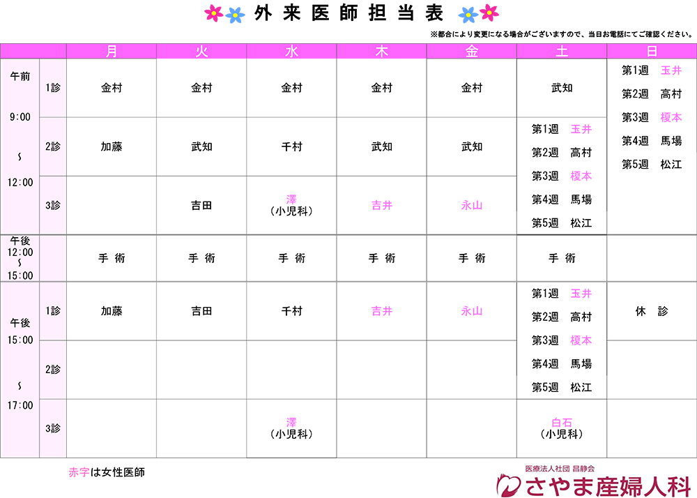 ※日曜日の診療は、当院で分娩予約された妊婦様のみとなります。(祝日の場合、休診となります)